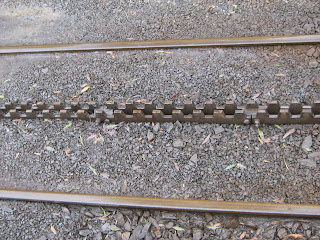 It is done pretty well - the line runs along the King River for a bit, and then has to go up and over a steep hill to get to the Queen River and Queenstown. So steep is the incline that a special technique was developed by a Swiss clockmaker named Abt - essentially the engine is fitted with cogged wheels which fit into notches in a central rail (a rack and pinion system):